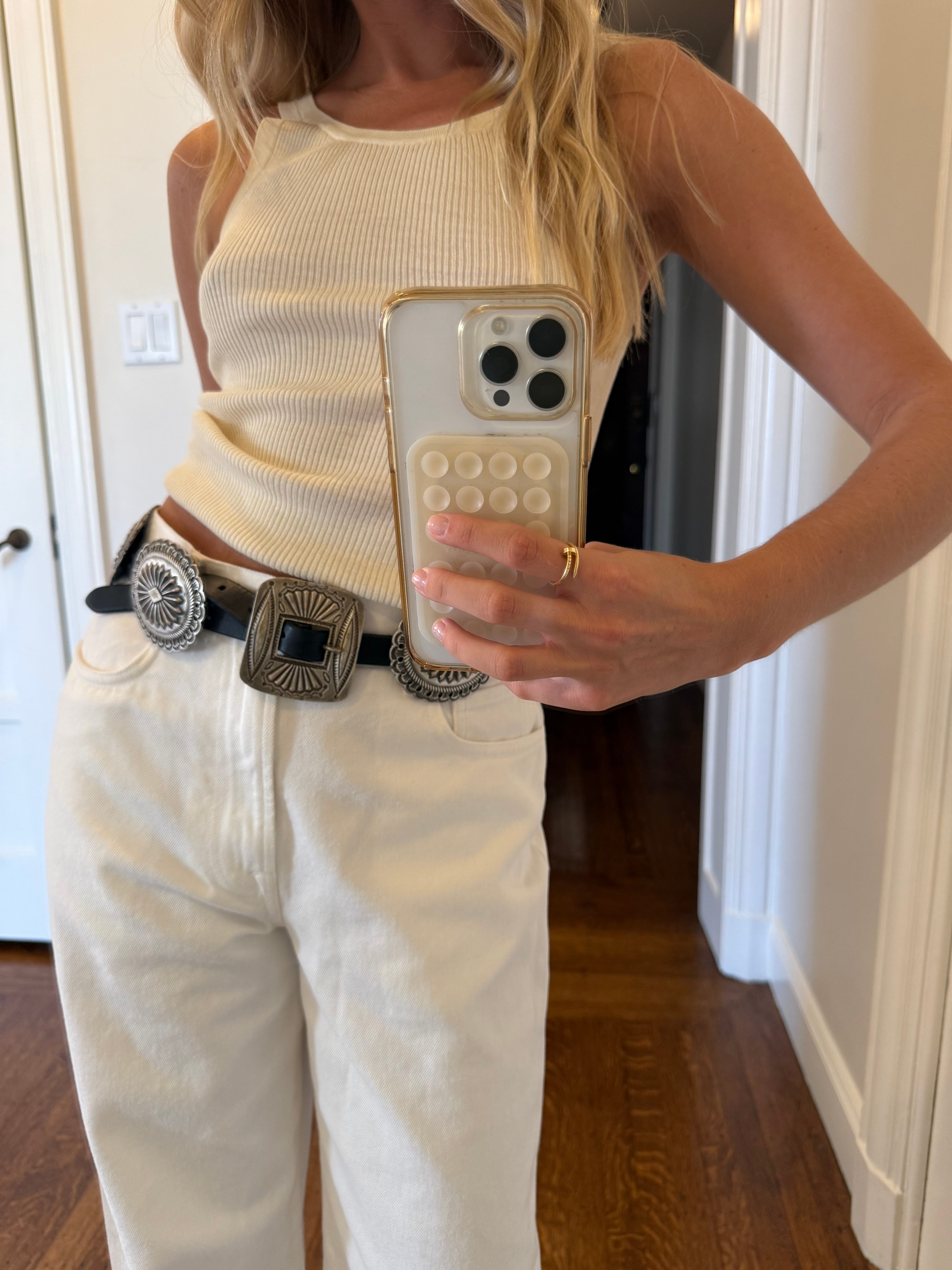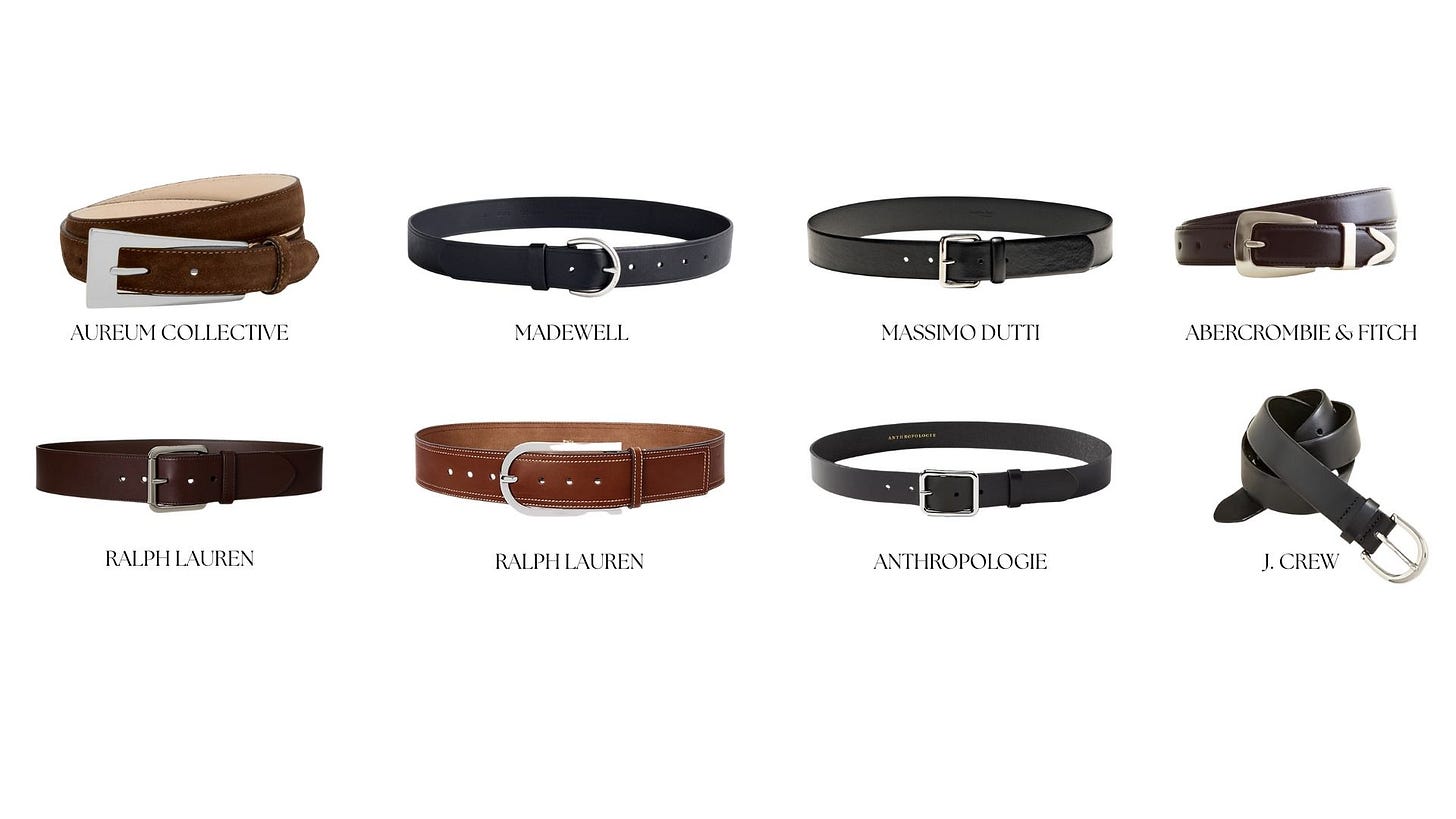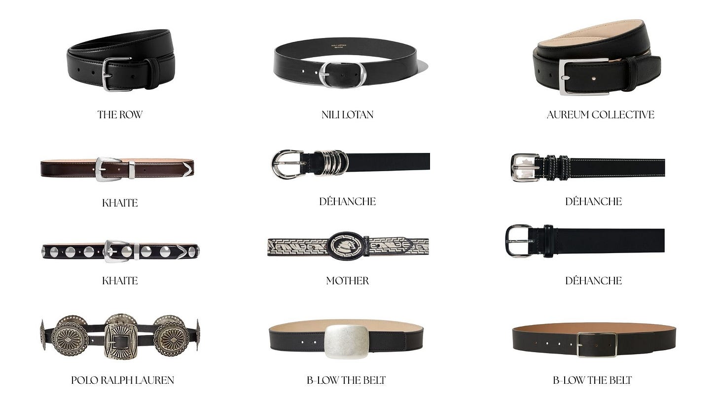 I’ve organized a mix of high-low belts that can be worn into every season, dressed up or down. Personally, I’m usually reaching for a black belt with silver hardware, or something in brown suede. Love a suede.